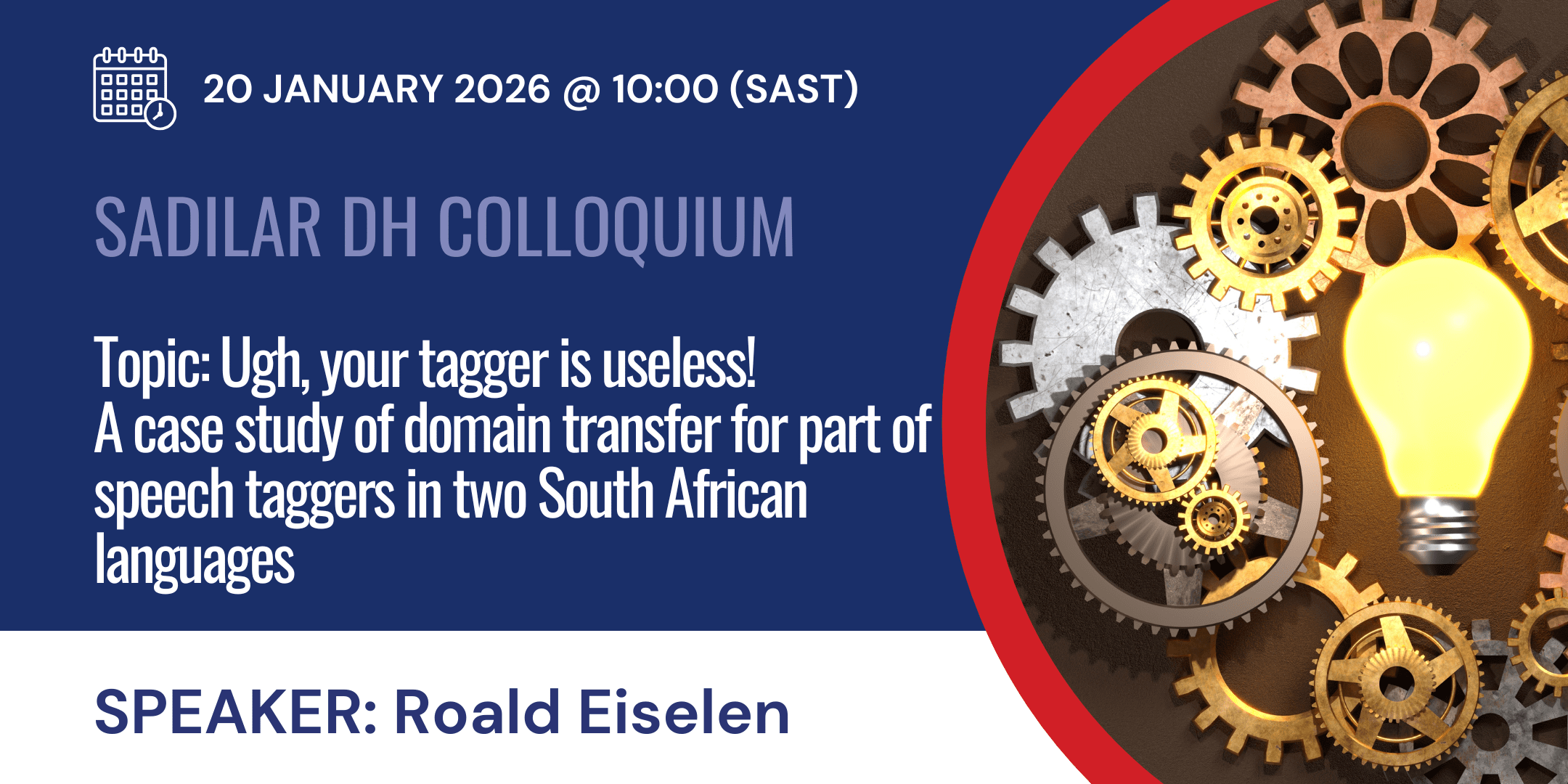 SADiLaR organizes monthly Digital Humanities colloquia. These typically take place on Wednesdays (in the middle of the month) from 10:00 to 11:00 SAST. During these DH colloquia a wide variety of topics are discussed, mostly on content related to Digital Humanities, sometimes focusing more on the techniques or methodologies used, sometimes focusing more on the applications or application areas.