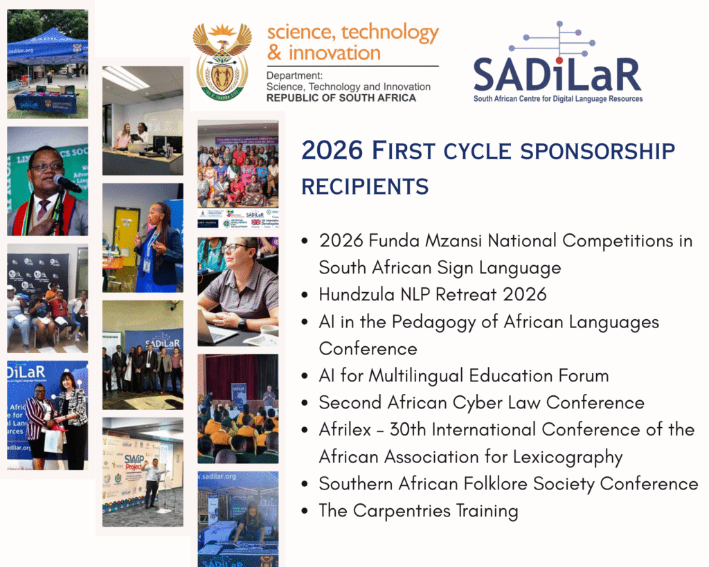 The South African Centre for Digital Language Resources (SADiLaR) is pleased to announce the recipients of its 2026 first cycle sponsorships, awarded to initiatives that align with the centre’s mandate to strengthen research, technology development and digital inclusion across South Africa’s official languages.